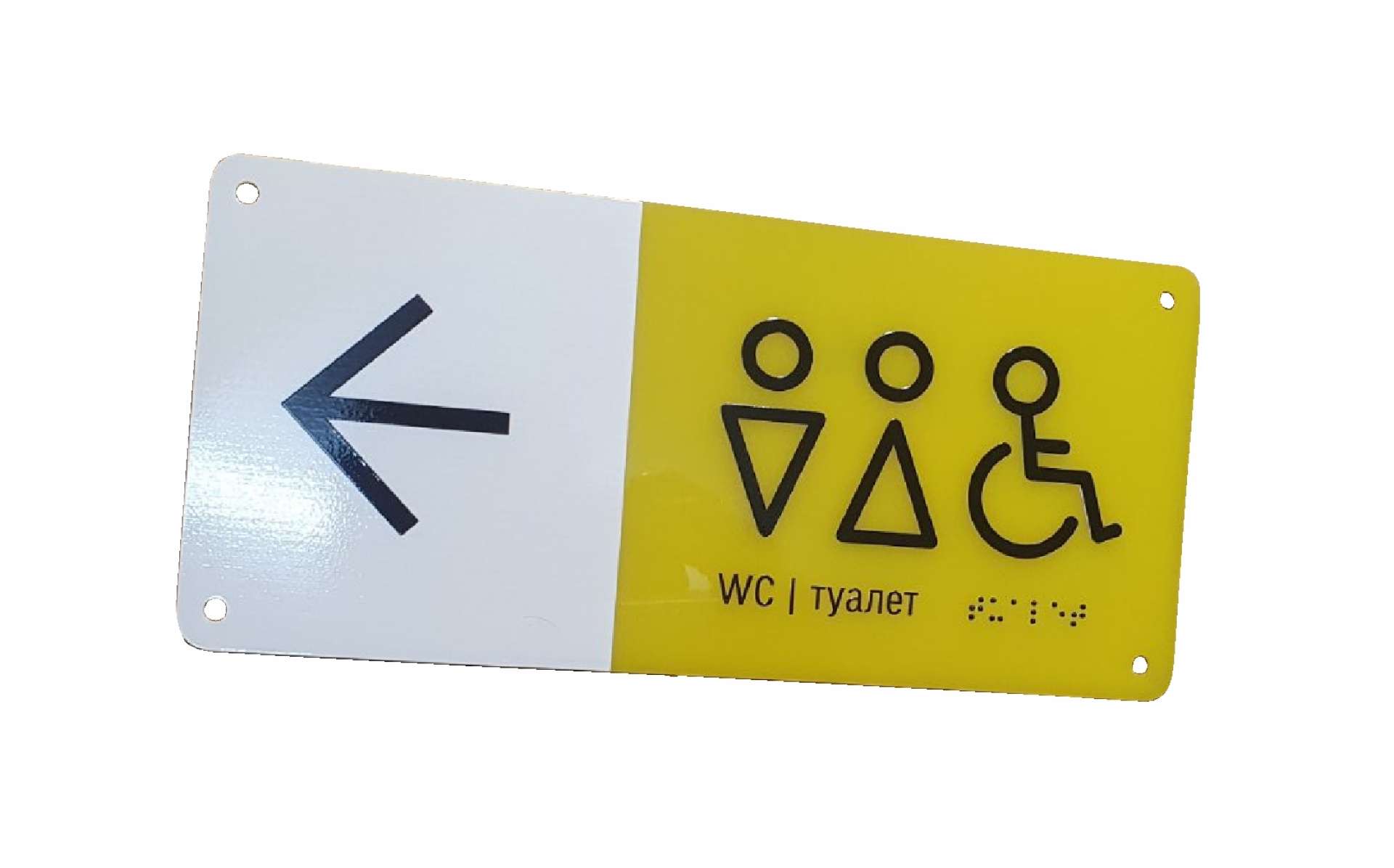Жовта акрилова табличка зі шрифтом Брайля невеликого розміру. Виготовляється зі спеціальним шрифтом для людей з обмеженими можливостями. Застосовується магазинами, аптеками, державними установами при вході у приміщення.