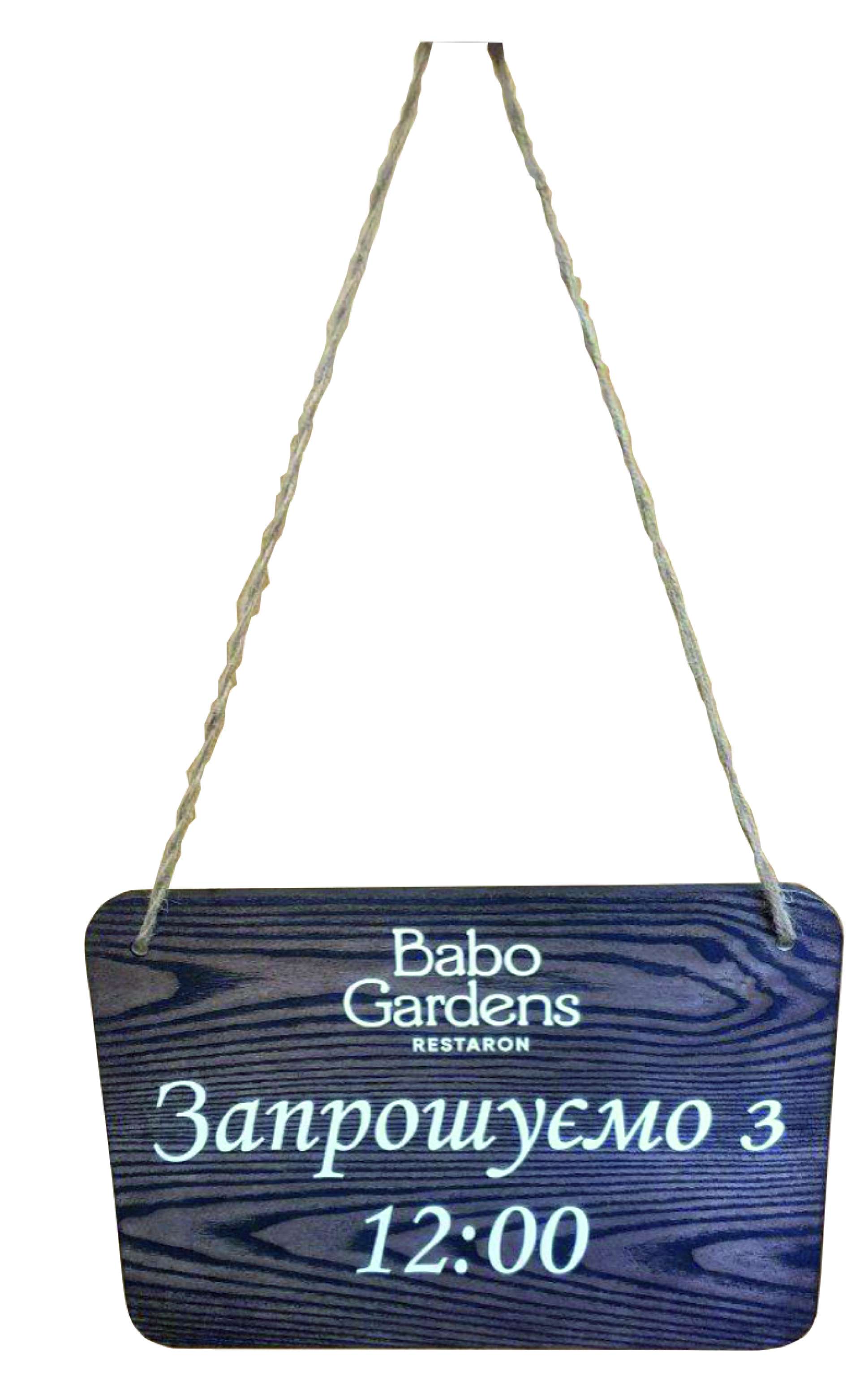 Дерев'яна табличка з якісного дерева (Ясень) пофарбована та нанесений текс. Текст зроблений фарбою або глибоким фрезуванням. Табличка товщиною 15-20 мм на мотузці.