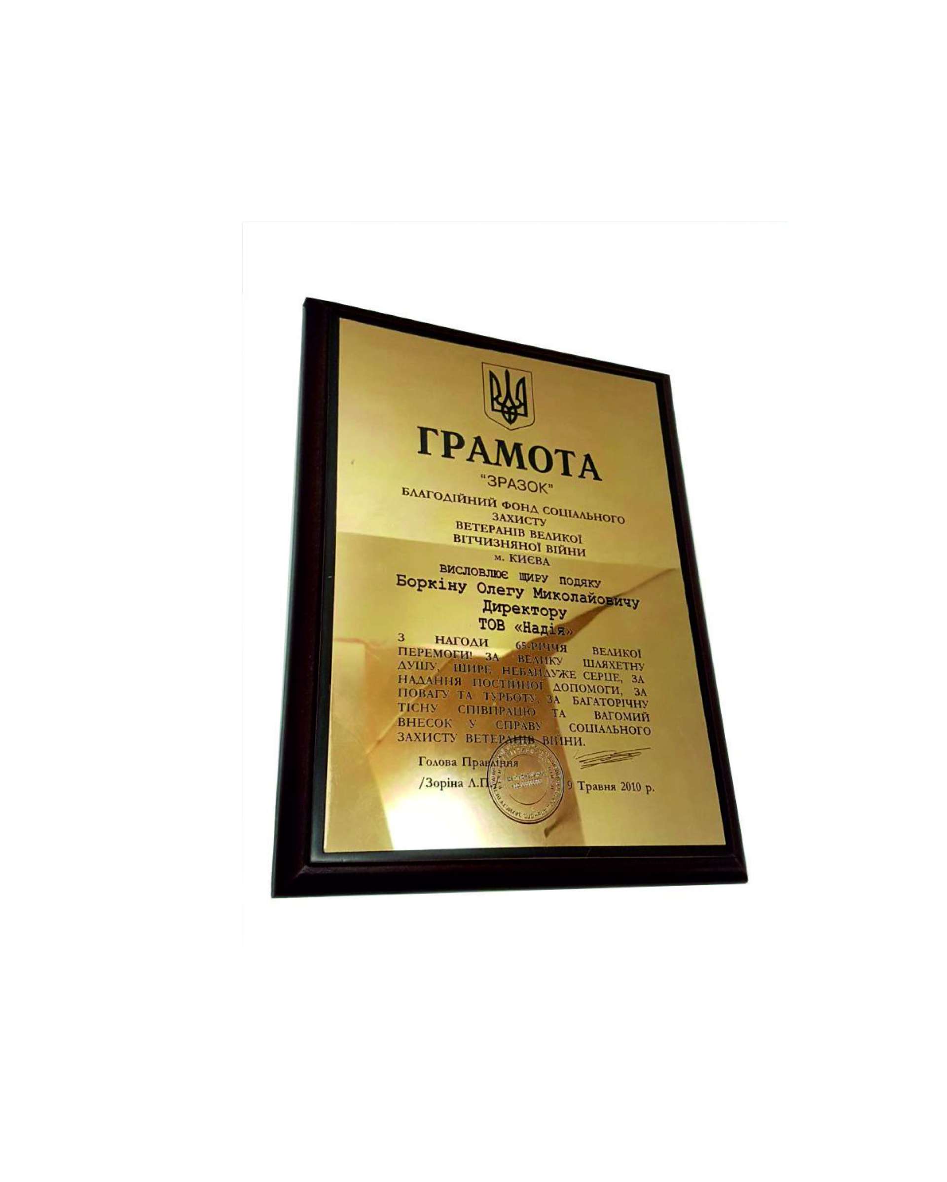 Грамота на золотистому пластику з дерев'яною підкладкою.