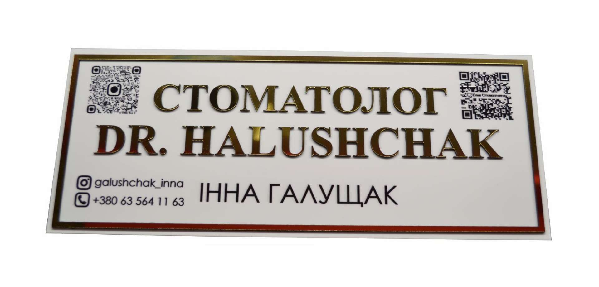 Офісна рельєфна табличка з акрилу або ПВХ та золотистого пластику. Рельєфне зображення виходить за рахунок приклеєних поверх білої поверхні золотистих букв. Табличку офісну можна виготовити будь-якого розміру.