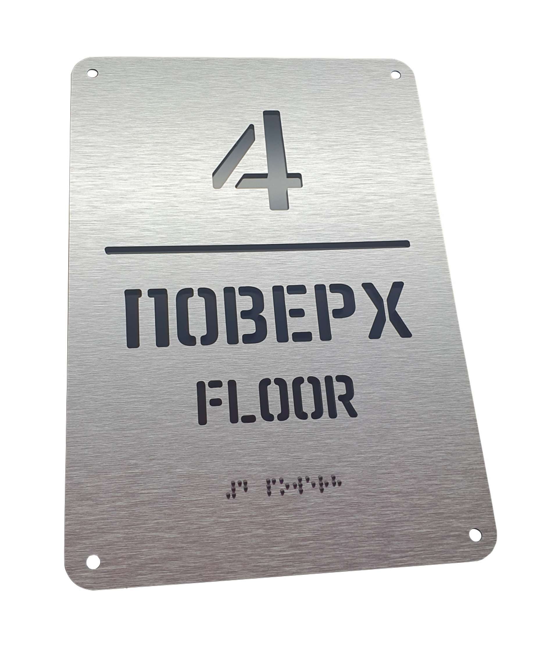 Табличка поверх зі шрифтом Брайля з алюмінієвого композиту. На табличку наноситься сквозний текст та шрифт Брайля, з обратної сторони підкладається пластикова основа для контрасту коліру. Така табличка виглядає естетично і служить довгою тривалістю експлуатацією.