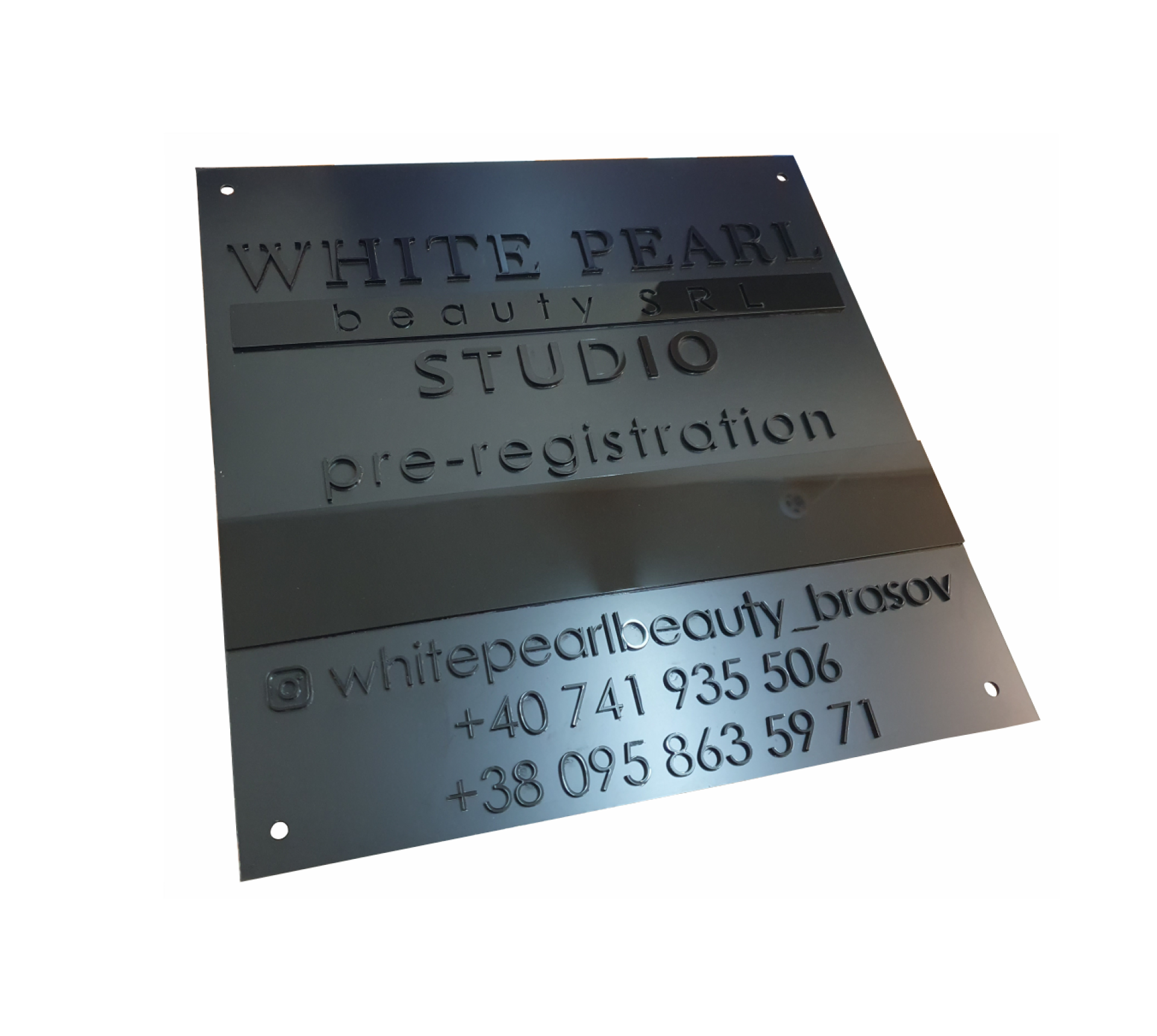 Вывеска объёмная с рельефными черными буквами из акрила на черном композите. Данная вывеска подходит для наружного и внутреннего использования.